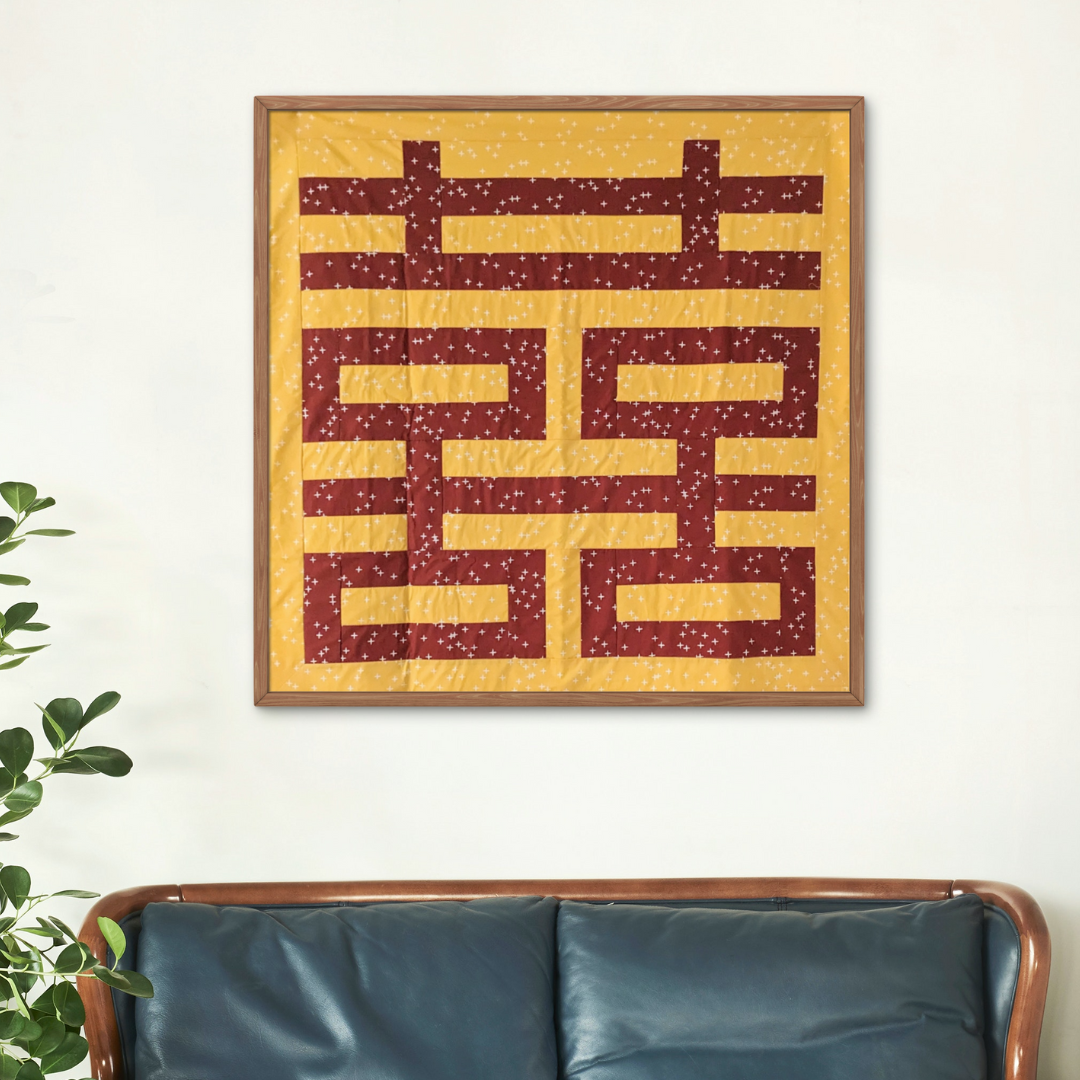 Our handmade organic quilt with the Chinese symbol for Double Happiness is a unique and meaningful piece of art. Double Happiness is an iconic symbol that has been used in Chinese culture for centuries. The symbol is thought to bring luck, joy, and good fortune to those who display it and is often seen in Chinese weddings, on wedding cards, and on decorations. Perfect for the newly married couple, this wall hanging will be a treasured memento of their special day.