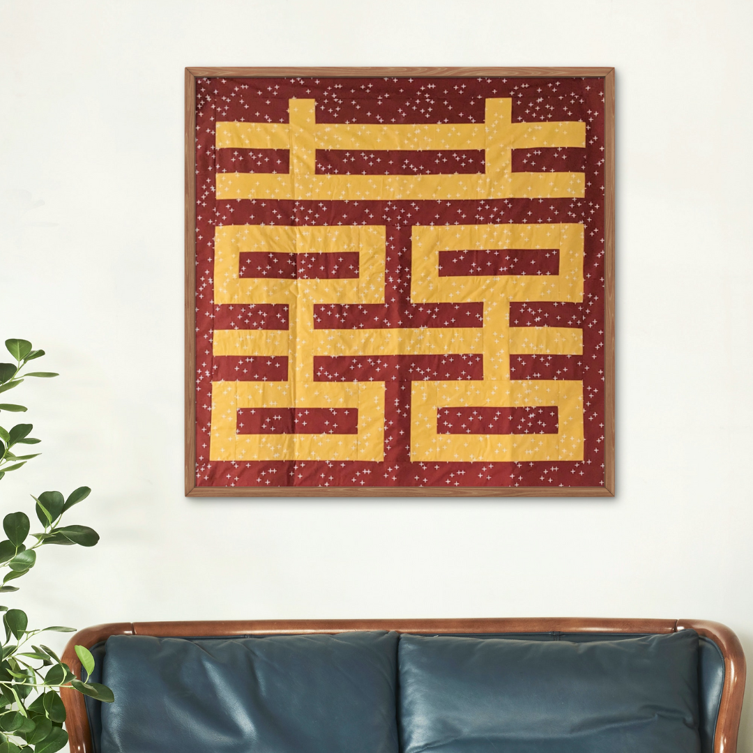 Our handmade organic quilt with the Chinese symbol for Double Happiness is a unique and meaningful piece of art. Double Happiness is an iconic symbol that has been used in Chinese culture for centuries. The symbol is thought to bring luck, joy, and good fortune to those who display it and is often seen in Chinese weddings, on wedding cards, and on decorations. Perfect for the newly married couple, this wall hanging will be a treasured memento of their special day.